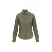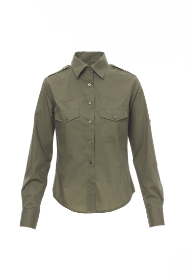 Fijngeweven damesoverhemd van gekamd katoen, licht getailleerd, gevormde schouderpas aan de voorkant (niet bij de witte uitvoering), sluiting met bijpassende knopen en knoopsgaten met contrasterend stiksel (niet bij de witte uitvoering), epauletten, twee borstzakken met klep en penhouderlussen, oprolbare mouwen met handige stofbies en knoop. Gemakkelijk te onderhouden stof.